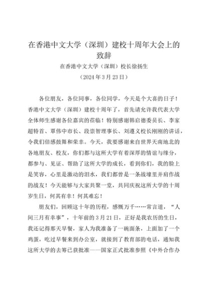 / 领导讲话:20240323在香港中文大学(深圳)建校十周年大会上的致辞——校长徐扬生