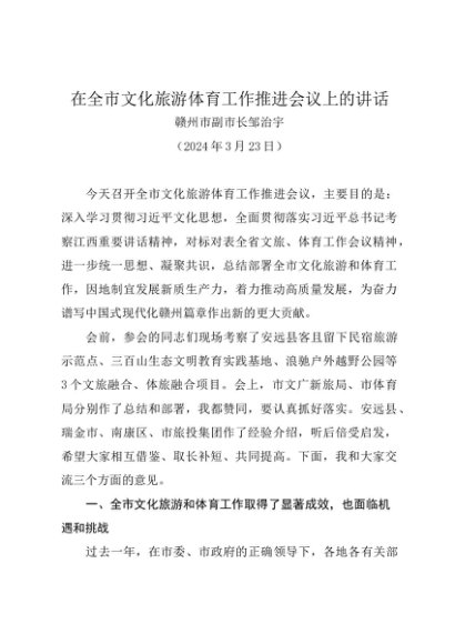 / 领导讲话:20240323在全市文化旅游体育工作推进会议上的讲话——赣州市副市长邹治宇