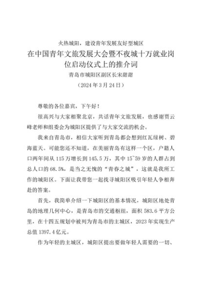 / 领导讲话:20240324在中国青年文旅发展大会暨不夜城十万就业岗位启动仪式上的推介词——青岛市城阳区副区长宋甜甜