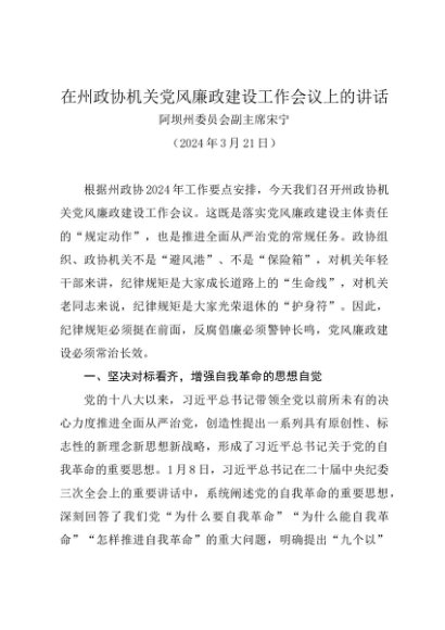 / 领导讲话:20240321在州政协机关党风廉政建设工作会议上的讲话——阿坝州委员会副主席宋宁
