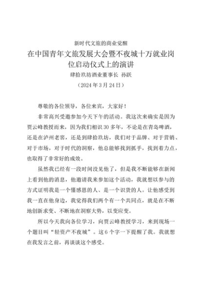 / 领导讲话:20240324在中国青年文旅发展大会暨不夜城十万就业岗位启动仪式上的演讲——肆拾玖坊酒业董事长 孙跃