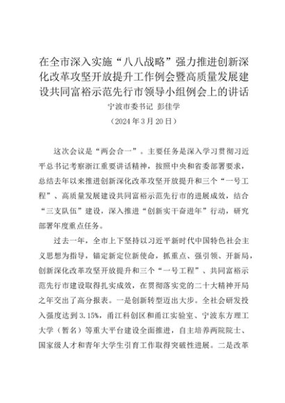 领导讲话:20240320在全市深入实施“八八战略”强力推进创新深化改革攻坚开放提升工作例会暨高质量发展建设共同富裕示范先行市领导小组例会上的讲话——宁波市委书记