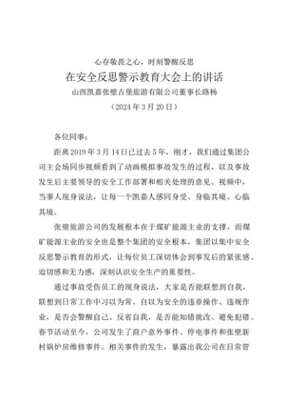 / 领导讲话:20240320在安全反思警示教育大会上的讲话——山西凯嘉张壁古堡旅游有限公司董事长路杨