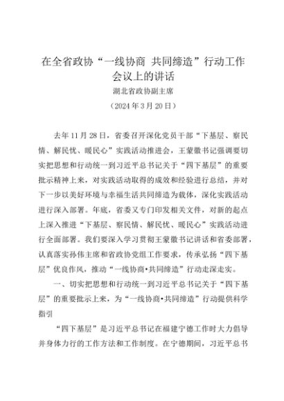 / 领导讲话:20240320在全省政协“一线协商 共同缔造”行动工作会议上的讲话——湖北省政协副主席