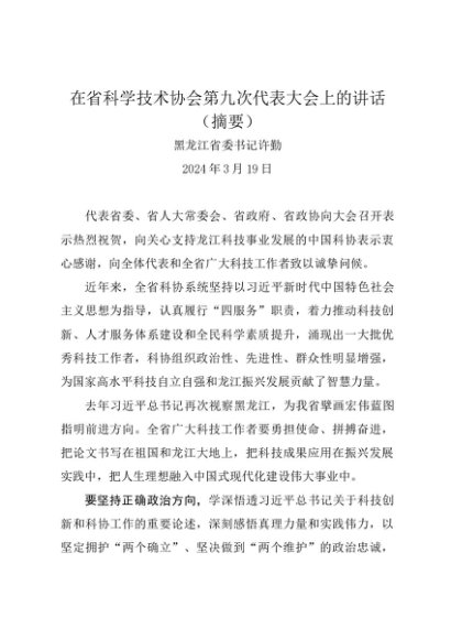 / 领导讲话:20240319在省科学技术协会第九次代表大会上的讲话(摘要)——黑龙江省委书记许勤