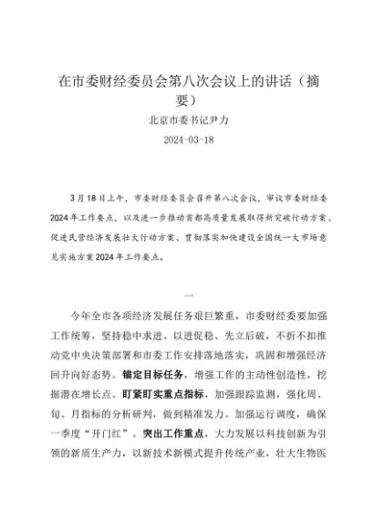 / 领导讲话:20240318(财经委员会)在市委财经委员会第八次会议上的讲话(摘要)——北京市委书记尹力