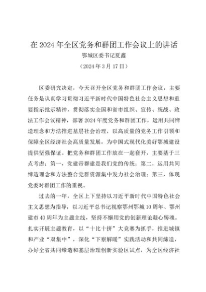 / 领导讲话:20240317在2024年全区党务和群团工作会议上的讲话——鄂城区委书记夏鑫