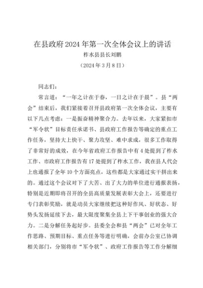 / 领导讲话:20240308(新年度工作部署)在县政府2024年第一次全体会议上的讲话——柞水县县长刘鹏
