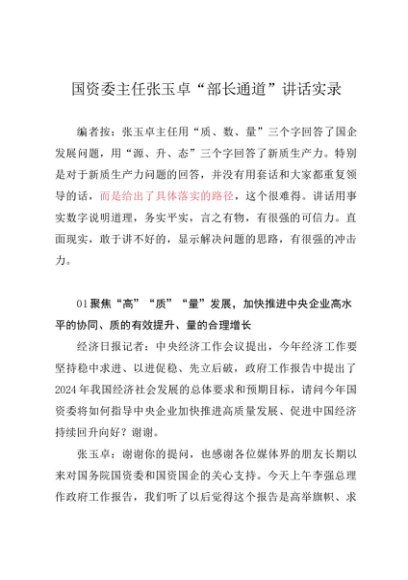 / 领导讲话:20240305国资委主任张玉卓在两会“部长通道”上的讲话实录