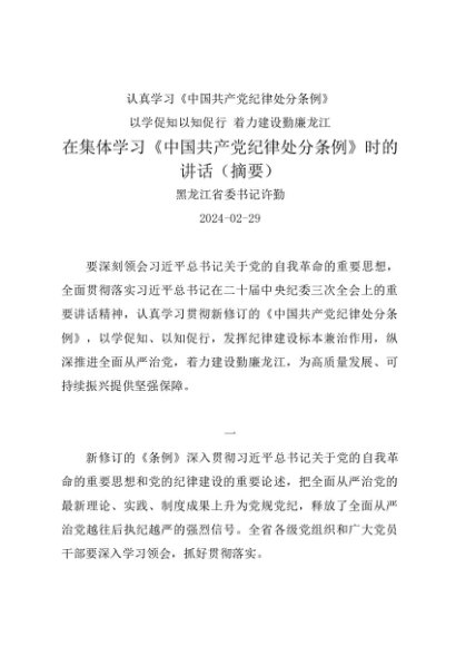 / 领导讲话:20240229在集体学习《中国共产党纪律处分条例》时的讲话(摘要)——黑龙江省委书记许勤