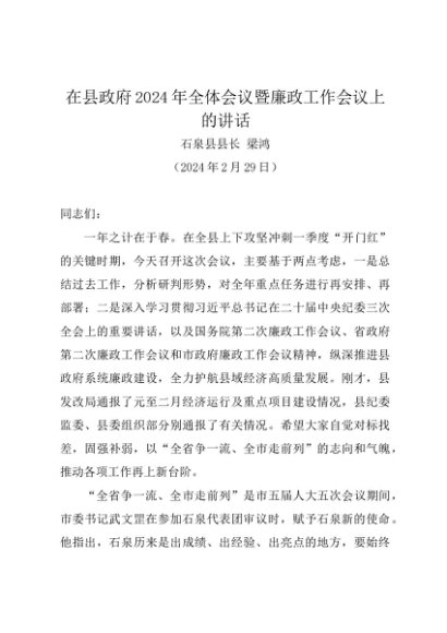 领导讲话:20240229(全体会议,廉政工作)在县政府2024年全体会议暨廉政工作会议上的讲话——石泉县县长