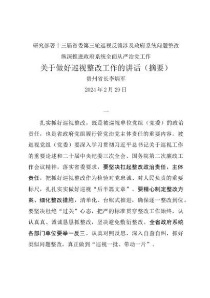 / 领导讲话:20240229关于做好巡视整改工作的讲话(摘要)——贵州省长李炳军