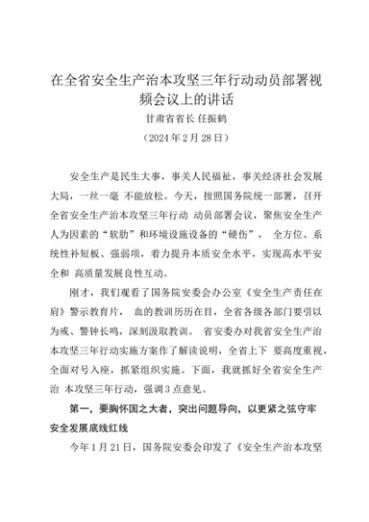 / 领导讲话:20240228在全省安全生产治本攻坚三年行动动员部署视频会议上的讲话——甘肃省省长 任振鹤