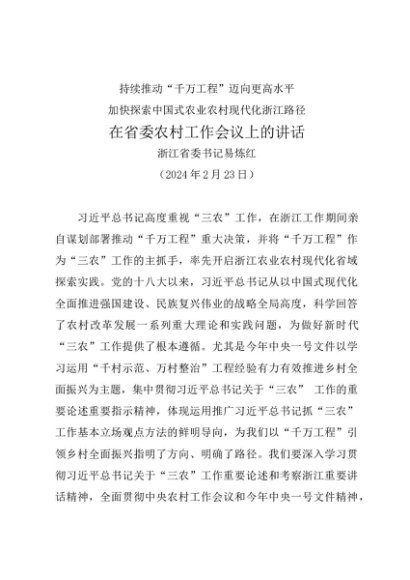 / 领导讲话:20240223在省委农村工作会议上的讲话——浙江省委书记易炼红(4200字)