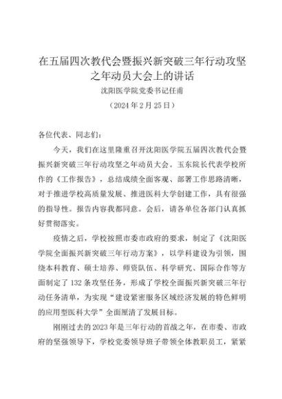 / 领导讲话:20240225(教代会)在五届四次教代会暨振兴新突破三年行动攻坚之年动员大会上的讲话——沈阳医学院党委书记