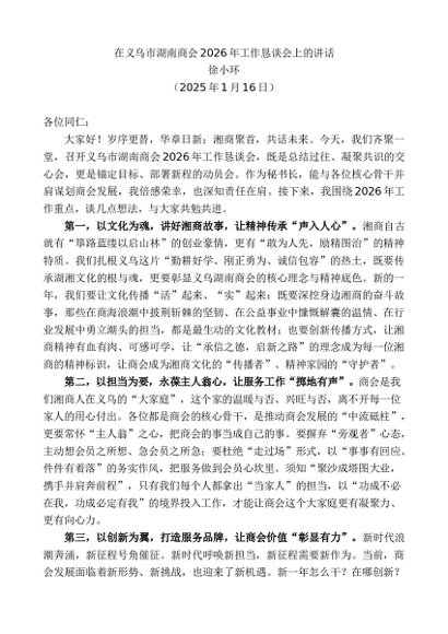 / 领导讲话:20260130徐小环:在义乌市湖南商会2026年工作恳谈会上的讲话