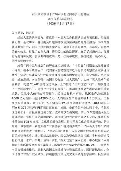 / 领导讲话:20260130九江市委书记刘文华:在九江市政协十六届六次会议闭幕会上的讲话