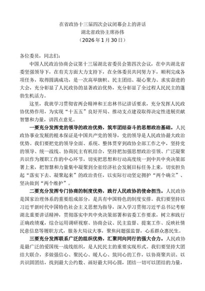 领导讲话:20260130湖北省政协主席孙伟:在省政协十三届四次会议闭幕会上的讲话