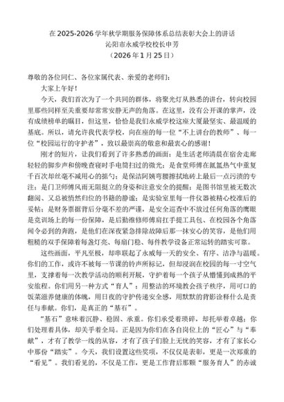 / 领导讲话:20260130沁阳市永威学校校长申芳:在2025-2026学年秋学期服务保障体系总结表彰大会上的讲话