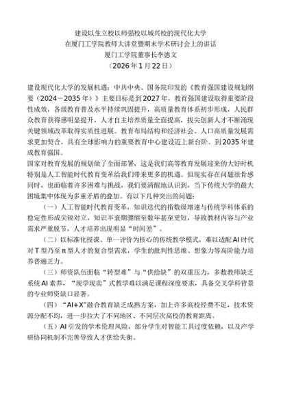 / 领导讲话:20260130厦门工学院董事长李德文:在厦门工学院教师大讲堂暨期末学术研讨会上的讲话