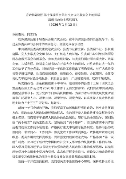 / 领导讲话:20260130渭源县政协主席韩鹏飞:在政协渭源县第十届委员会第六次会议闭幕大会上的讲话