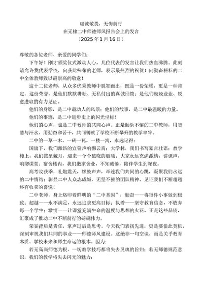 / 领导讲话:20260130在无棣二中师德师风报告会上的发言:虔诚敬畏,无悔前行