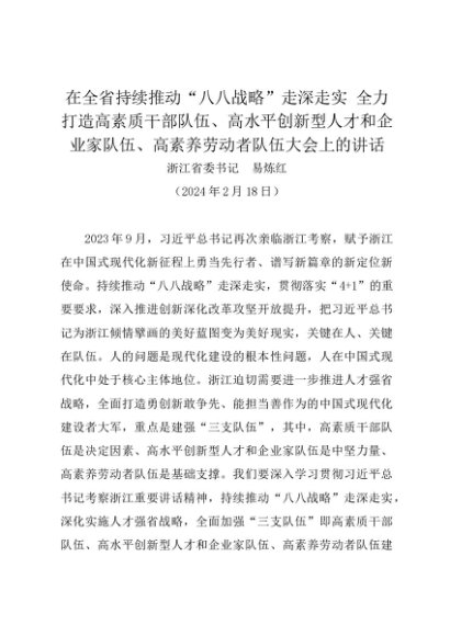 / 领导讲话:20240218在全省持续推动“八八战略”走深走实 全力打造三支队伍大会上的讲话——浙江省委书记 易炼红