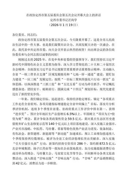 / 领导讲话:20260130定西市委书记汪尚学:在政协定西市第五届委员会第五次会议开幕大会上的讲话