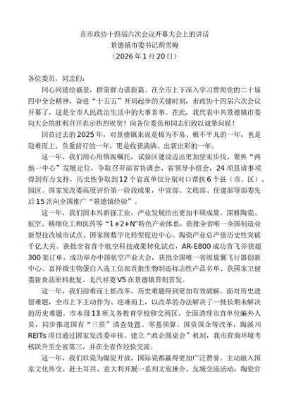 / 领导讲话:20260130景德镇市委书记胡雪梅:在市政协十四届六次会议开幕大会上的讲话