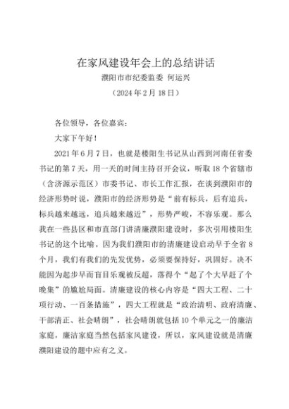 / 领导讲话:20240218在家风建设年会上的总结讲话——濮阳市市纪委监委
