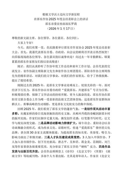 / 领导讲话:20260130在邵东作协2025年度总结表彰会上的讲话:根植文学沃土迈向文学新征程