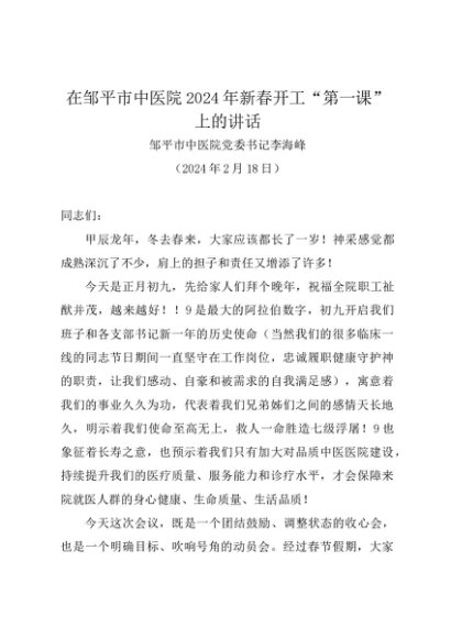 / 领导讲话:20240218在邹平市中医院2024年新春开工“第一课”上的讲话——医院党委书记