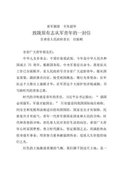 领导讲话:20240209(征兵工作会议)致陇原有志从军青年的一封信——甘肃省长