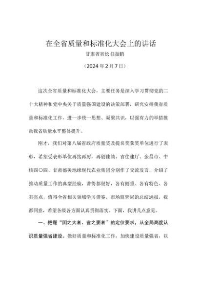 / 领导讲话:20240207在全省质量和标准化大会上的讲话——甘肃省省长 任振鹤