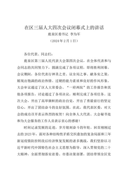/ 领导讲话:20240201在区三届人大四次会议闭幕式上的讲话——鹿泉区委书记