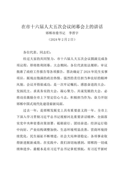 / 领导讲话:20240202在市十六届人大五次会议闭幕会上的讲话——邯郸市委书记