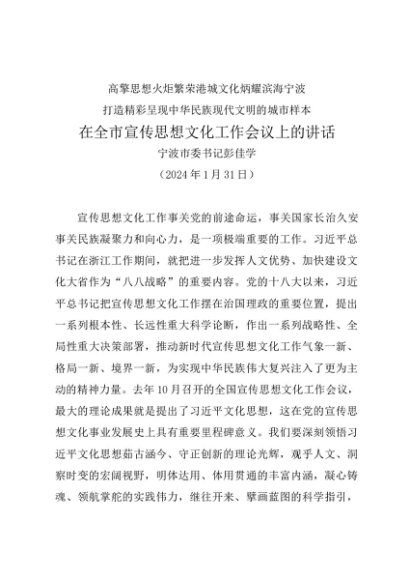 / 领导讲话:20240131(宣传思想文化工作会议)在全市宣传思想文化工作会议上的讲话——宁波市委书记