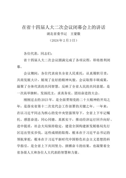 领导讲话:20240203在省十四届人大二次会议闭幕会上的讲话——湖北省委书记 王蒙徽