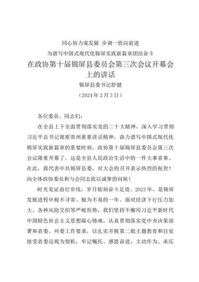 / 领导讲话:20240203在政协第十届锦屏县委员会第三次会议开幕会上的讲话——锦屏县委书记