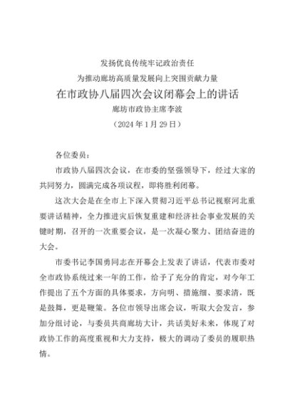 / 领导讲话:20240129在市政协八届四次会议闭幕会上的讲话——廊坊市政协主席
