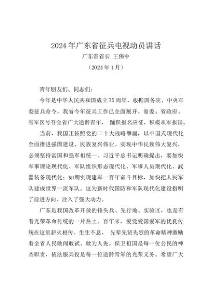 / 领导讲话:20240130(征兵工作会议)在2024年广东省征兵电视动员讲话——广东省省长 王伟中