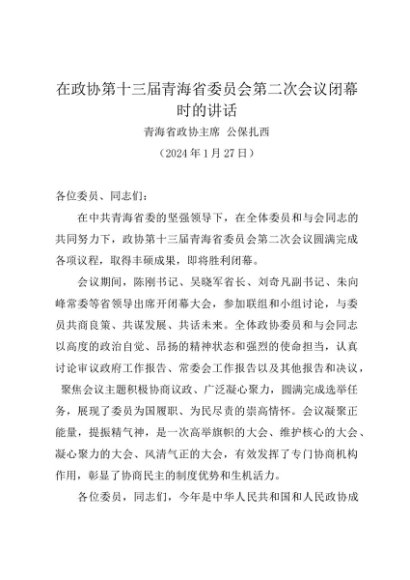 / 领导讲话:20240127在政协第十三届青海省委员会第二次会议闭幕时的讲话——青海省政协主席 公保扎西