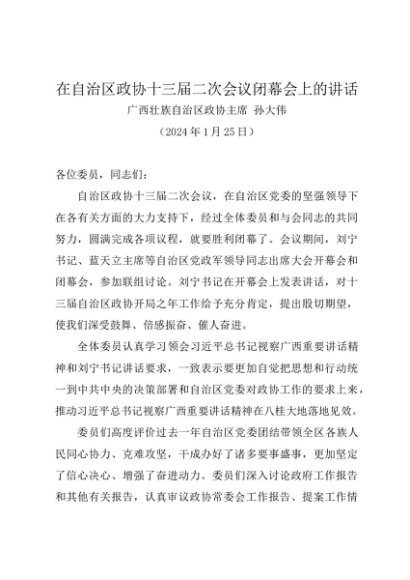 领导讲话:20240125在自治区政协十三届二次会议闭幕会上的讲话——广西壮族自治区政协主席 孙大伟