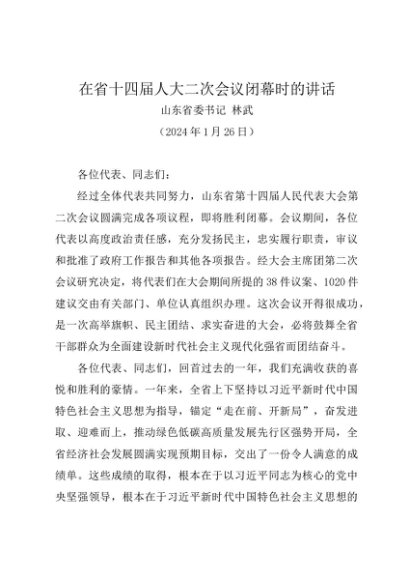 / 领导讲话:20240126在省十四届人大二次会议闭幕时的讲话——山东省委书记 林武