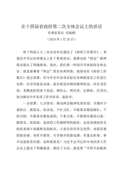 领导讲话:20240126(全体会议,落实省两会精神,部署年度工作)在十四届省政府第二次全体会议上的讲话——甘肃省省长 任振鹤