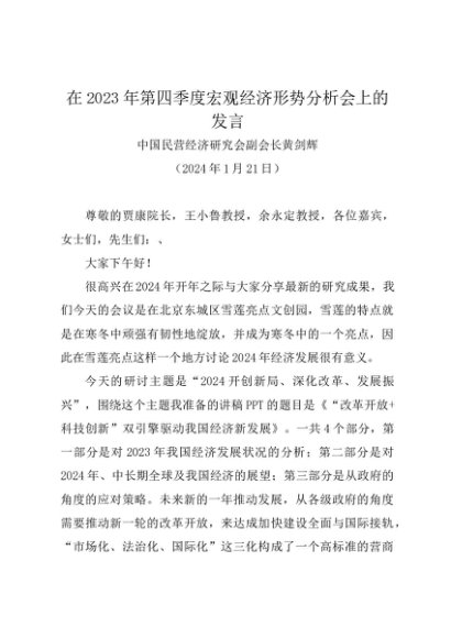 / 领导讲话:20240121在2023年第四季度宏观经济形势分析会上的发言——中国民营经济研究会