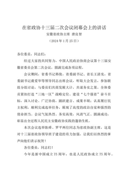 / 领导讲话:20240125在省政协十三届二次会议闭幕会上的讲话——安徽省政协主席 唐良智