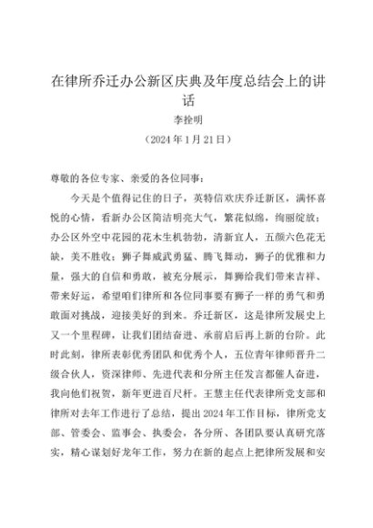 / 领导讲话:20240121在律所乔迁办公新区庆典及年度总结会上的讲话