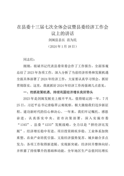 / 领导讲话:20240118(经济工作会议)在县委十三届七次全体会议暨县委经济工作会议上的讲话——剑阁县县长
