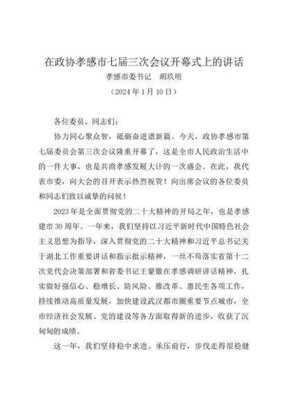 / 领导讲话:20240110在政协孝感市七届三次会议开幕式上的讲话——孝感市委书记